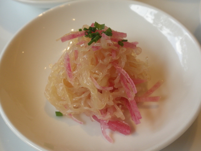 クラゲと紅芯大根の和え物: 極細に切ったクラゲと紅芯大根ですが、何とも上品な味わい。