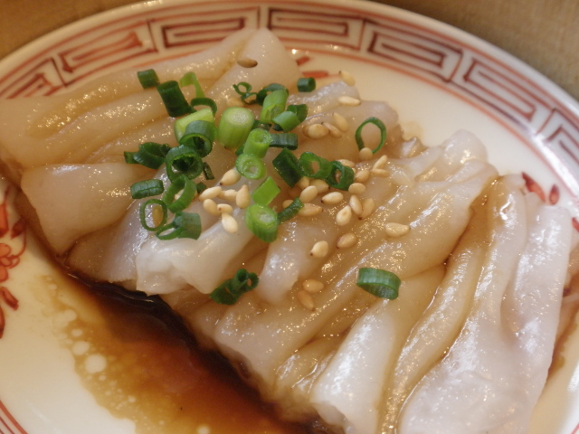 ひだをよせたような腸粉の上に胡麻と葱がのり、醤油で味付けされています。