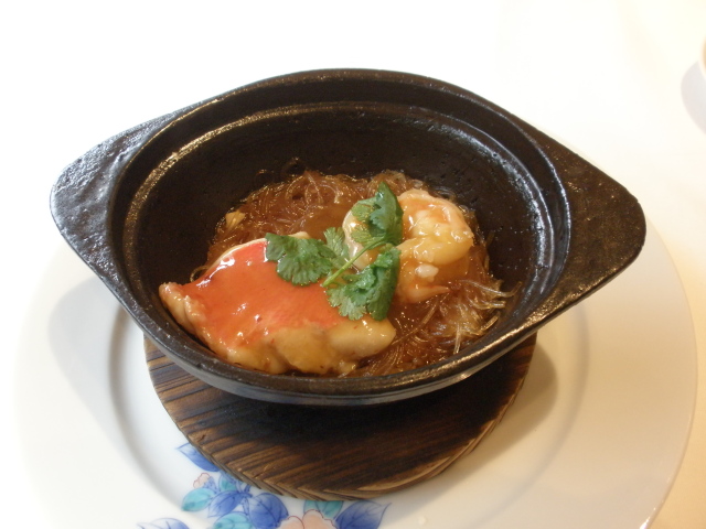 本日の海鮮料理: 金目鯛と海老 春雨のXO醤土鍋煮込みがブツブツと煮えたぎる土鍋で提供されました。
