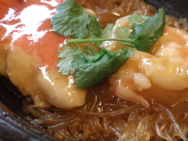 XO醤風味の春雨は大蒜、生姜等の香味野菜と唐辛子が効かせてあり、魚介の旨味も吸って何と美味なこと!