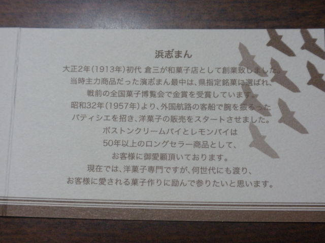 創業当時和菓子を作っていたお店が、横浜が洋風化されていくのにならって洋菓子を製造するようになったそうで、店名の「浜志゛まん」に‘゛(濁点)’が付いているところもおもしろいです。