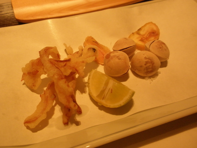 お通し:さきいかの天ぷら、塩炒り銀杏、栗せんべい