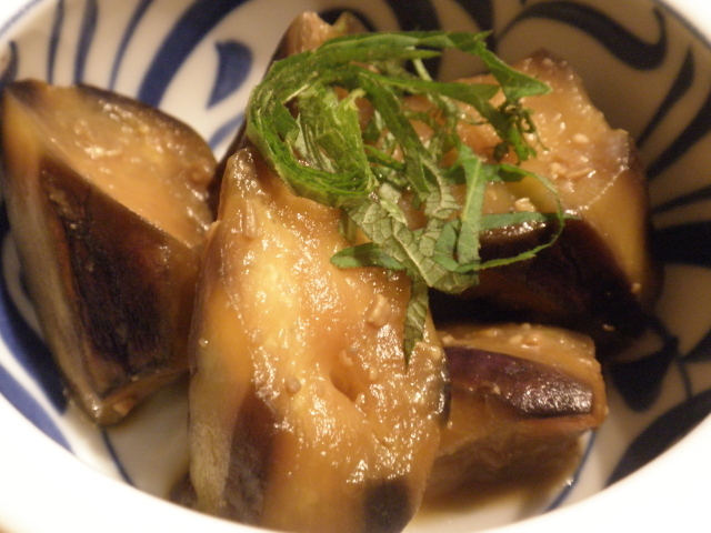 煮物: 胡麻油で炒り煮したような茄子に刻んだ大葉がのせられていました。