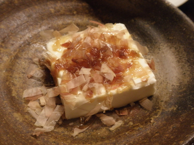 お豆腐(600円): 丸くこんもりとした豆腐に小葱、大葉、鰹節がたくさんかかっています。