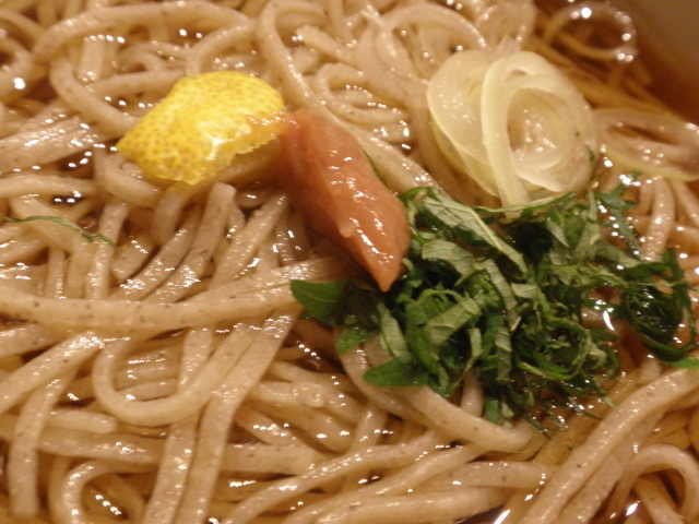 ホシが点在する細切りの蕎麦にたっぷりと汁がはられて、大葉と柚子がのっています。