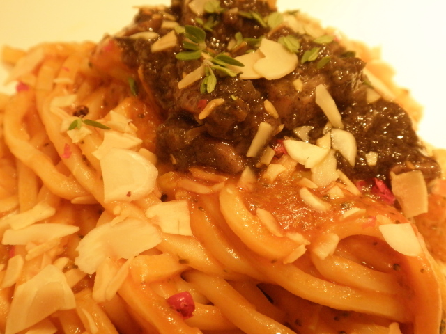 サルサポモドーロ コン ネロ ディ セッピア: トマトソースに絡められた低加水パスタフレスカの上にイカの墨煮、その上に細かく砕いたアーモンドとタイムがかけられていました。