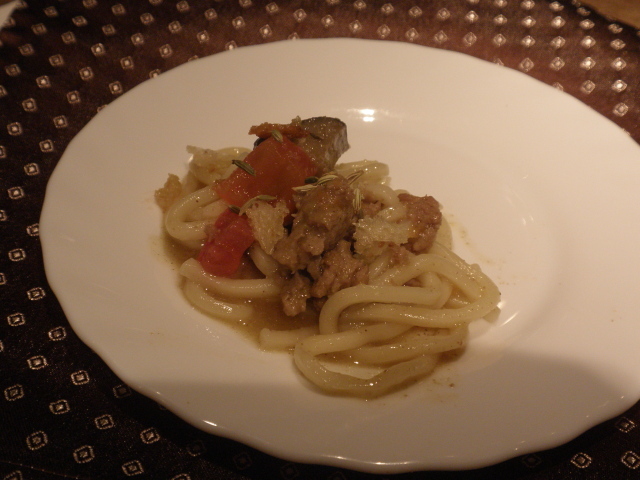 サルシッチャ クアトロ スタジョーネ: サルシッチャからの甘い脂が溶け出たオリーブオイルがナスとトマトに滲み込み、ペコリーノがコクを、フェンネルシードが爽やかな香りを与えています。