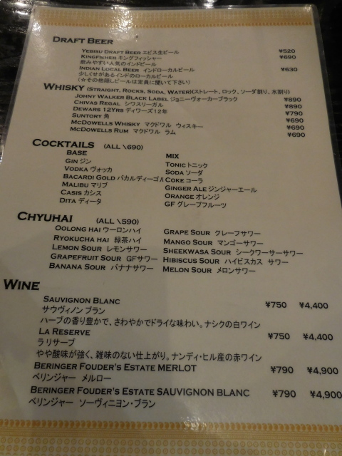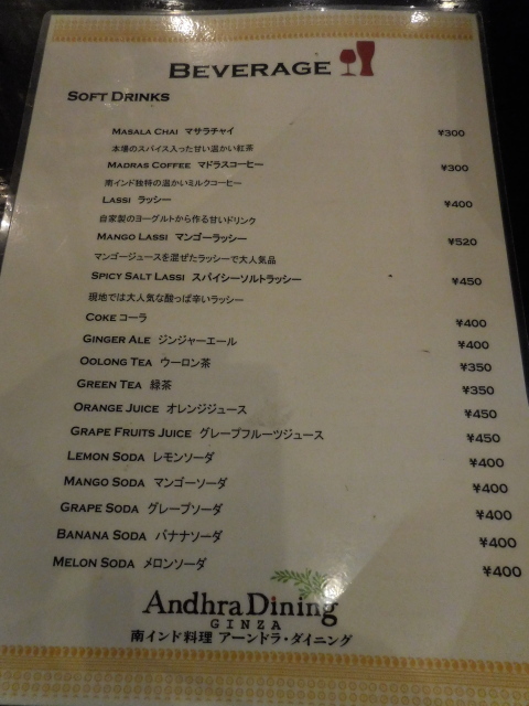マサラチャイ、マドラスコーヒー、ラッシー、マンゴーラッシー、スパイシーソルトラッシー、コーラ、ジンジャーエール、ウーロン茶、緑茶、オレンジジュース、グレープフルーツジュース、レモンソーダ、マンゴーソーダ、グレープソーダ、バナナソーダ、メロンソーダ