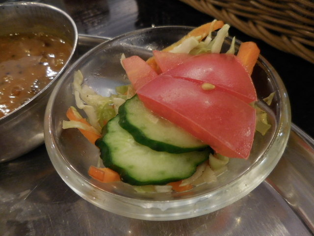 サラダ: キャベツ、ニンジン、キュウリのスライス、カットしたトマトのサラダに、(サウザンアイランドレッシングではない)甘いドレッシングがかかっていました。