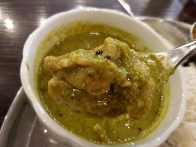 チキンカリー: 緑がかった黄色いルーに大ぶりなチキンが入っています。
