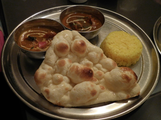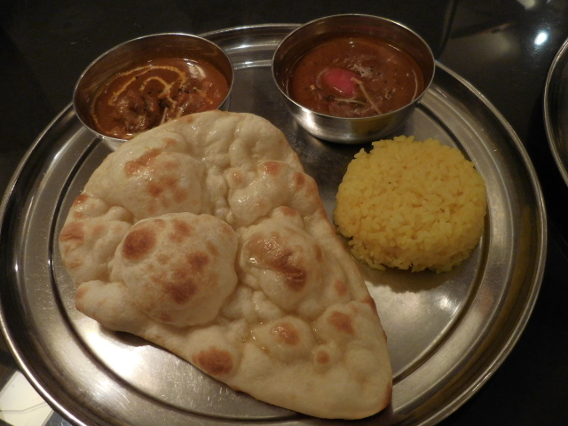 木への想い: カリー2種類とハーフナン、ハーフライスがターリ皿にのって運ばれてきました。