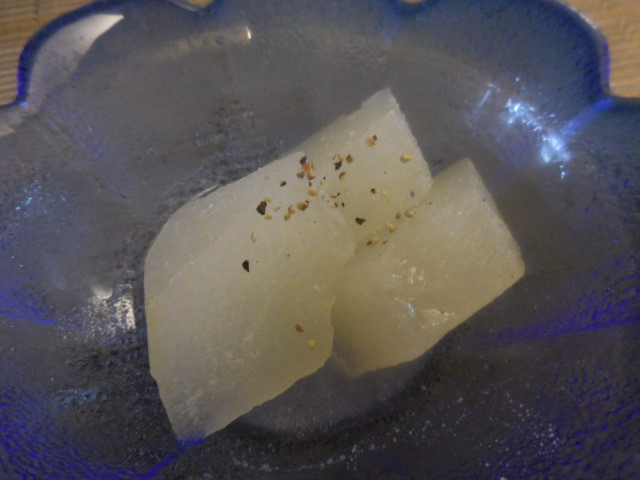 冬瓜の冷やし鉢: 鶏風味のコンソメで煮含ませたような洋風な味付けは、和風を予想していたのでちょっと意表を突かれました。