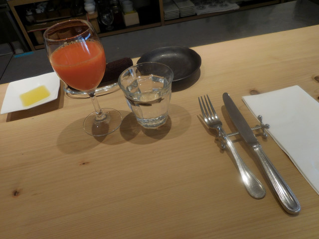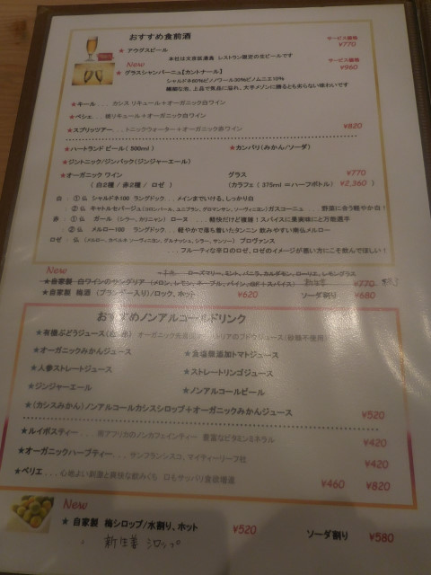 ノンアルコールドリンク(すべて520円)の中で有機ぶどうジュース(白・赤)、食塩無添加トマトジュース、人参ストレートジュースで迷って奥様にお伺いすると、有機ぶどうジュース(白・赤)は氷を入れて、食塩無添加トマトジュースと人参ストレートジュースは氷なしでの提供とのこと。