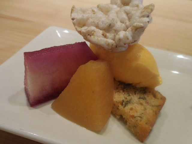 リンゴ、柿のコンポート、人参のアイスクリーム、野菜ケーキ