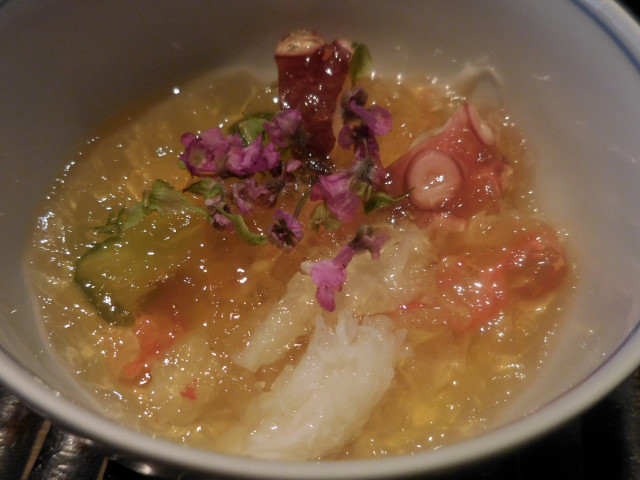 ズワイガニと明石のタコの土佐酢ゼリーがけ: ゼリーがきらきらと光り、紫蘇の花の色が映えてとても綺麗です。
