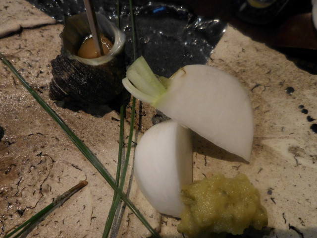 姫サザエの壷焼き、カブのセロリ味噌添え