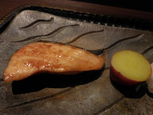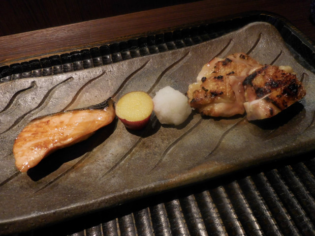 焼物二種: 鱒の照り焼と山梨県の信玄どりにさつまいもの甘露煮と大根おろしが添えられて来ました。