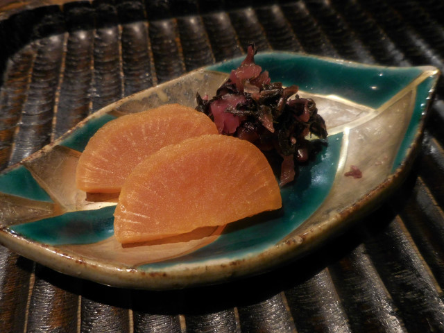 香の物: 芝漬けは甘味があって酢がきつくなく、大根の味噌漬けも甘めでしっかり味のもので、共に美味しかったです。
