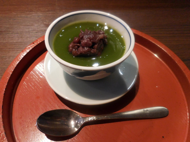 甘味: 抹茶ゼリーで、上に粒餡がのっていました。