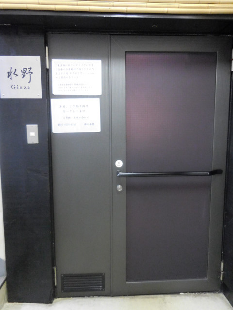 階段で2階に上がると、グレーの扉の脇に‘水野’と書かれた看板があり、その下には「本日ご予約で満席となっております」との貼紙があり、中が全く見えません。