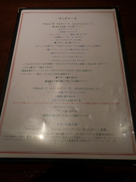 メニューには、ランチセットはお一人様1品の注文(お子様同伴はご注文できる年齢)で、パスタセット、軽いパスタコースの利用は来店から50分程度、他に待っている人がいる場合は席をお譲り下さい等の注意書きがありましたが、それも忙しい時間帯にできるだけ多くの方にロスなく利用してもらいたいことからなのでしょう。