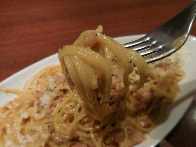 生クリームたっぷりのカルボナーラがお好きな方からすると全くの別物と感じるはずで、好みが分かれるかもしれません。