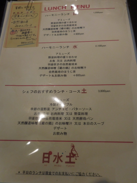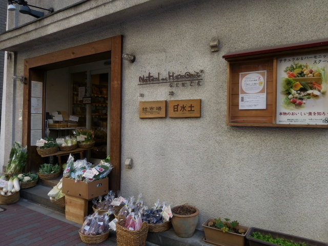 淡いグレーの壁に木の看板で‘日水土’と書かれ、店頭には野菜が並んでいました。
