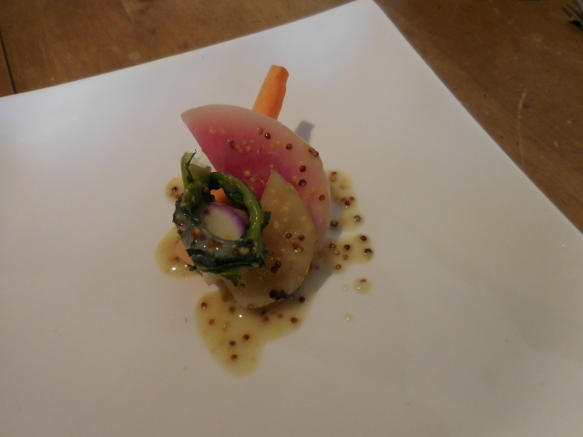 アミューズ: ダイコン、紅芯大根、ニンジン、小松菜等が色好く盛り付けられています。