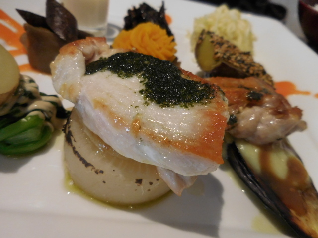 大根の白味噌豆乳グラタン、上に真鯛のポアレ