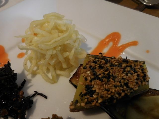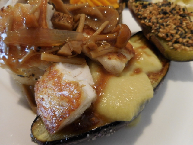 茄子のロースト: とろとろに柔らかいナスにクリーミィーな優しい味わいのソースがたっぷりかかかり、茄子の甘味を引き立てていました。