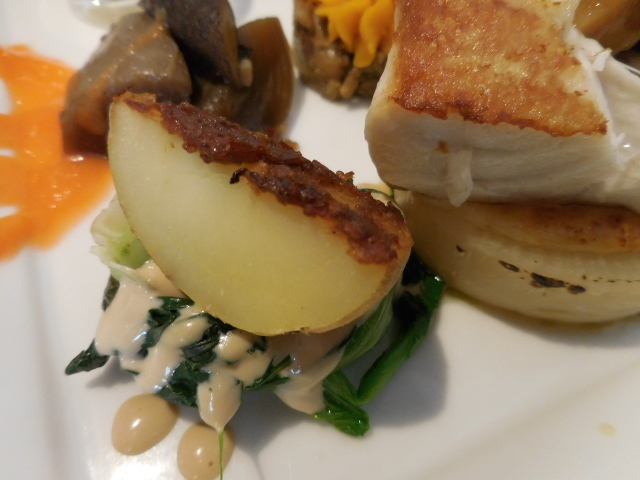 じゃがいもの牛蒡味噌 小松菜白胡麻豆乳ソース: 大きめカットのじゃがいもは牛蒡味噌で風味付けされてあり、ガーリックが効いていました。