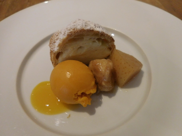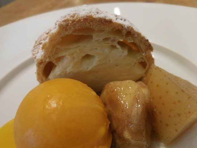 究極のシュークリーム: 半分にカットされたシュークリームに、洋梨とバナナのコンポートとマンゴーアイスクリームが添えられていました。