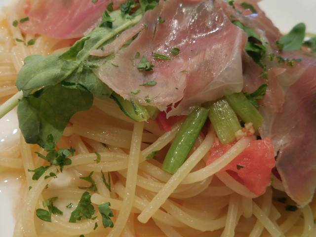 予約時にあらかじめPranzo Bでお魚料理を注文しておき、パスタはスペイン産イベリコ豚生ハムとルッコラのガーリックソースを選びました。