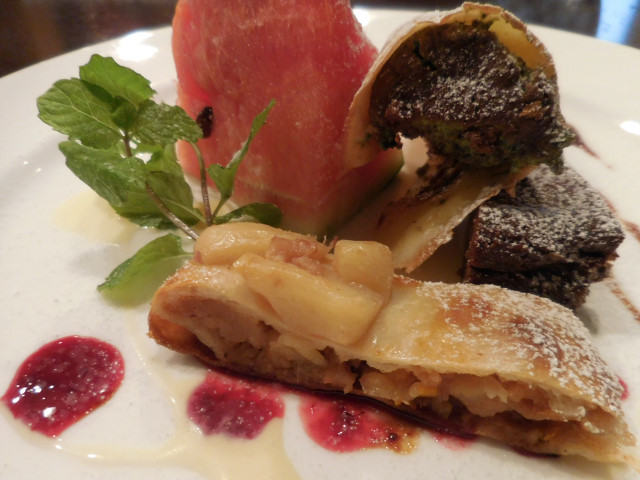 ベリー系の甘酸っぱいソースがデザートの甘さを引き立て、アクセントになっていました。