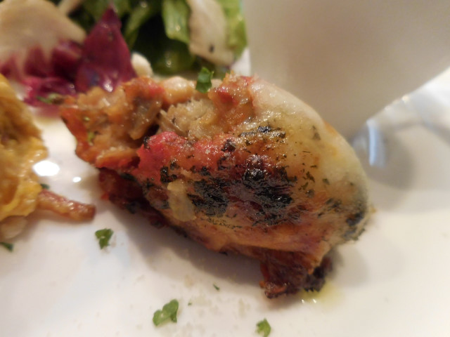 茄子とポテトのオーブン焼き: モッツァレラチーズとトマトを加えてあるそうで、ねっとりとした食感にモッツァレラの旨味がぐっと出てきます。