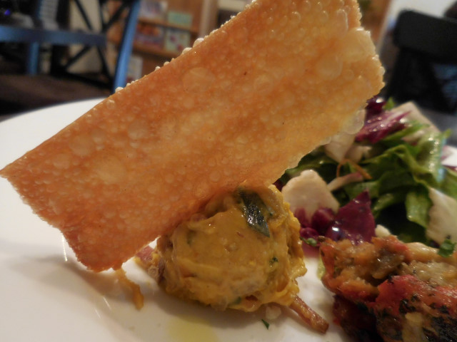 添えられていたのは揚げパスタで、サクッと香ばしくカボチャのサラダをつけていただくと、味に膨らみが出て美味でした。