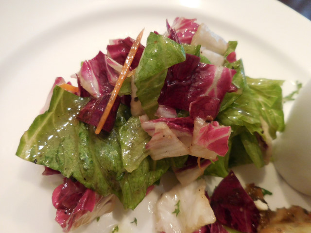 グリーンサラダ: レタス、トレビス、細切りニンジンをバルサミコ酢とオリーブオイルのドレッシングで和えてありました。