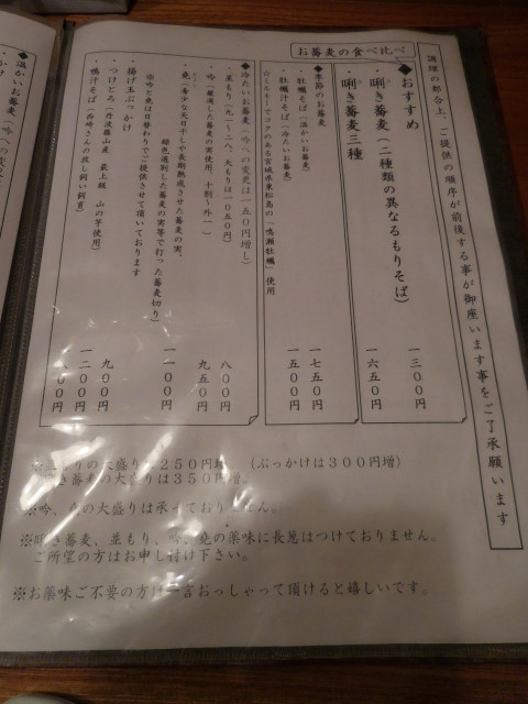 *並もりの大盛りは250円増(ぶっかけは300円増)、唎き蕎麦の大盛りは350円増