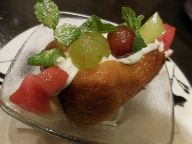 ババ・ナポレターナ: ナポリを代表するババの中央に生クリーム、スイカ、メロン、葡萄を綺麗にトッピングしてありました。