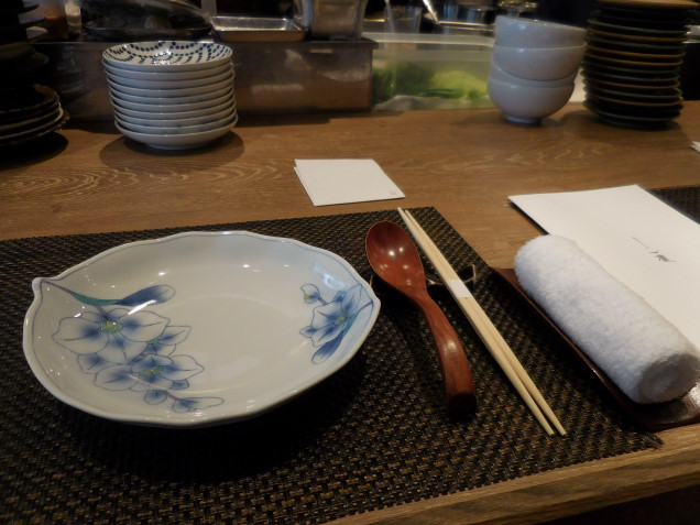 週末12時に予約して伺うと、入ってすぐ左側にあるカウンター席中央に通されました。