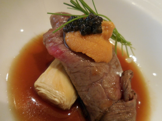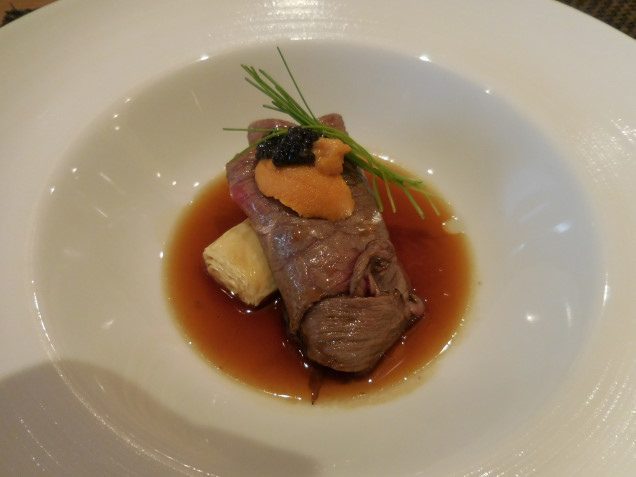 牛肉は適度にレアで柔らかく上品な旨味があり、雲丹とキャビアがアクセント。