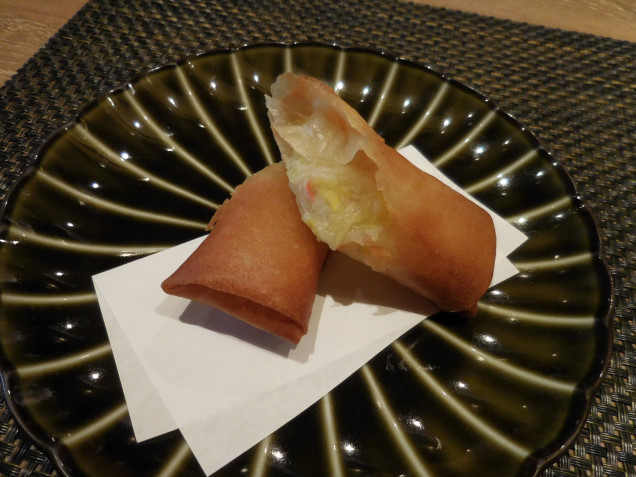 ズワイガニと娃娃菜(ワーワーツァイ)の春巻: ズワイガニと娃娃菜の餡が斜めカットされた春巻から見えています。