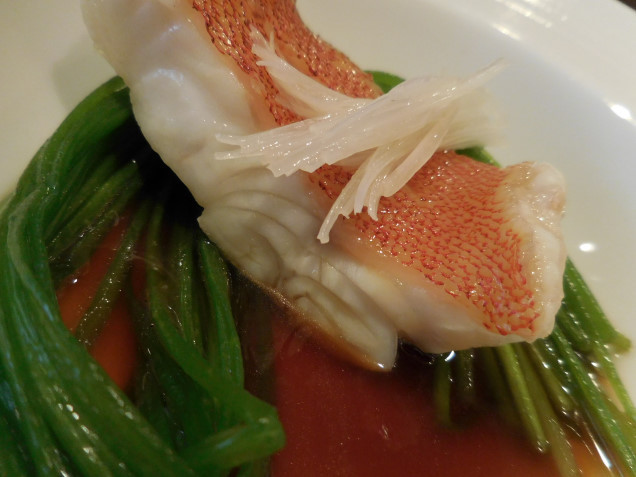 ふっくらとした赤ハタの火入れ加減が絶妙で旨味たっぷりな上に、シャクシャクとした水蓮菜の歯応えが実に軽快。