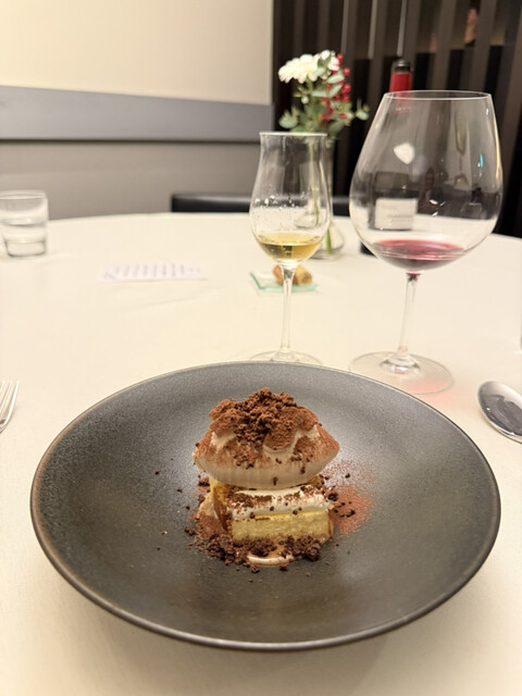 キンメダイはフリットみたいな歯応えで、外はカリカリ、中はしっとりとした食感がたまらない。そしてメインは、宮崎地鶏をロッシーニ風に仕上げた逸品。さすが宮崎大使の一皿!フォアグラの熱の通し方は、牛ヒレと合わせるときとは異なる絶妙な加減が施され、その技に感嘆するばかりだった。