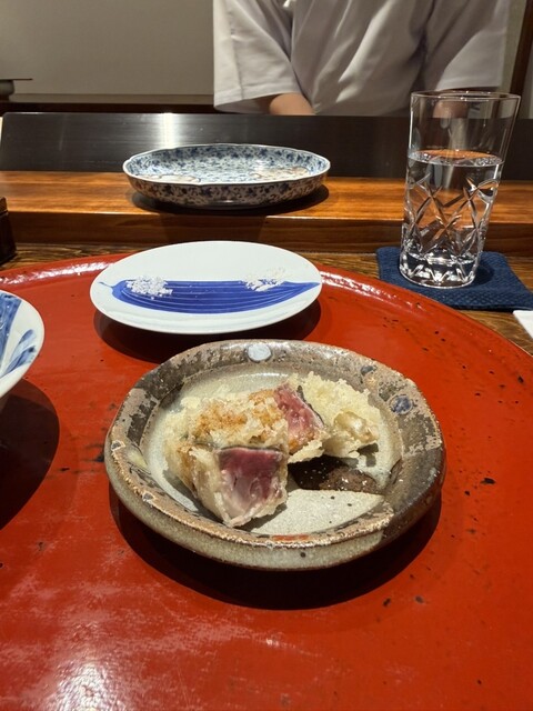 続くアオリイカ。ずいぶん軽い歯ごたえだと思ったら、細切りをまとめて揚げているとのこと。なるほど、そういう設計か。これは初めて。さすが中村さん、ちゃんと楽しませに来ている。