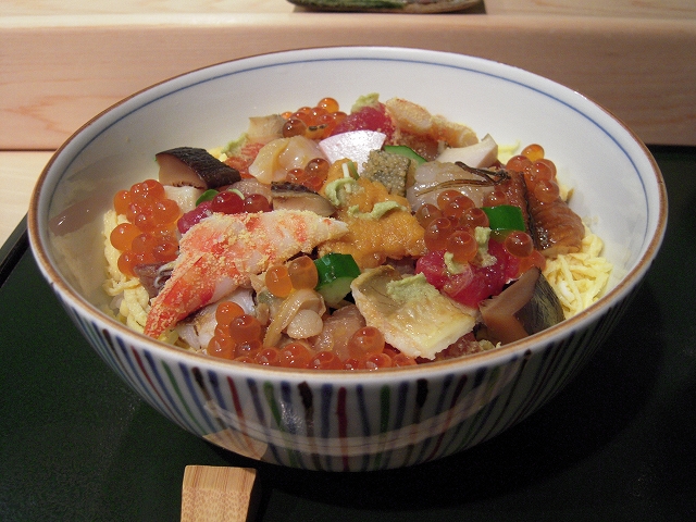 具材でしが、驚きでし。数種類のネタかと思ったら十種類以上あるのではないか(数えなかった)といふくらい、いろいろ入っておりやした。いくら・うに・えび・あなご(煮あなご)などは比較的大きめで、握りの半分か三分の一くらいの大きさで、目立つ存在でした。まぐろ(赤身)・ヅケ(これもあった)・こはだ・白身(なにかは不明)などは小さ目で握りの四分の一くらいでせうか。それでも見た目などはまさに『すし匠』のそれでし。その他あおやぎ・小柱・あさりなども出てきて、夜のコースのミニチュア版とも思へる内容でした。