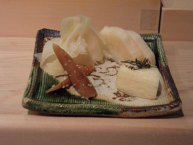 はしやすめといふには多いでせうか。左奥から、がり・たくあん(べったら漬けかな?)左手前がごぼう・やまいもでした。たくあんが一番しょっぱめといへばしょっぱめでしたが、それでも一様に軽めでし。これらもすし匠ではよくお目にかかるものでしね。