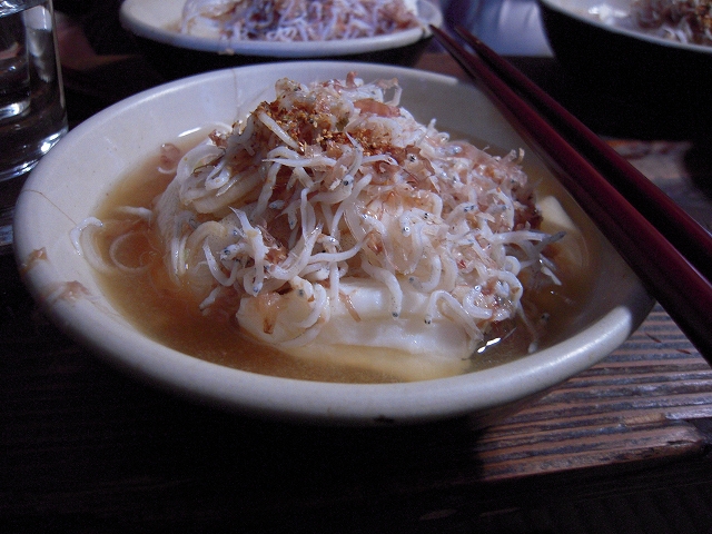 あっしが思うに、関東(都心部)の湯豆腐にはたいてい鱈が入っており、地方に行くと入らない気がいたしやし(あくまで私見)。あっしの言っている湯豆腐は、ただの鱈入り湯豆腐を、醤油と酢(ぽん酢ではない)にかつお節とねぎを入れたつけ汁につけて食べるのでしが、このお店のスペース等考えてのことか(器を減らす)それに酷似しただしといふかたれといったやうなものがかかっており、かつお節としらすも入っておりやし。見えにくいでしが、ねぎもかかっておりやし。