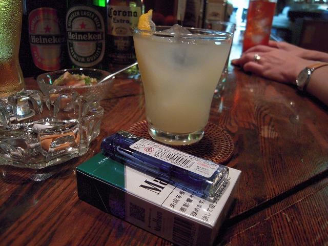 ・・・忘れやした。なんだっけこれ? ラムベースだったやうな気がしやし。ここではカクテルではなく、ビールかショットがお手軽でよいのかな?と思いやした。うん、たばこの煙とショットかなぁ・・・ ちなみに右に見えているお手は、同行された方の奥方のものでありやし(いちおう)。