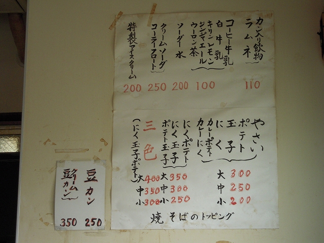 これはんまいでし! やきそばで最も大切なこと、それはその店の年季でし。つまりフライパンとか、鉄板に染みついた味とかほりがやきそばの味を決めることになり、これだけはどんなにがんばってもあたらしい店では手に入らないものでし。さすが60年以上の年季はすんばらしいでし。やきそばをソースでぐじゅぐじゅと煮込んだやうなものではなく、しっかり『焼いて』ありやし。焦げ臭くならない程度にちらっと焦がしてあることも大変重要でし。特筆はじゃがいもでした。おでんの写真の脇にてんこもりになっている粉吹芋が使われているみたいでしが、これも良く焼けており、ソースもちょうどよい具合に染みていて、すこーし焦げたかほりがしてサイコーにんまいでし♪ 他では食べられない味でしね。
